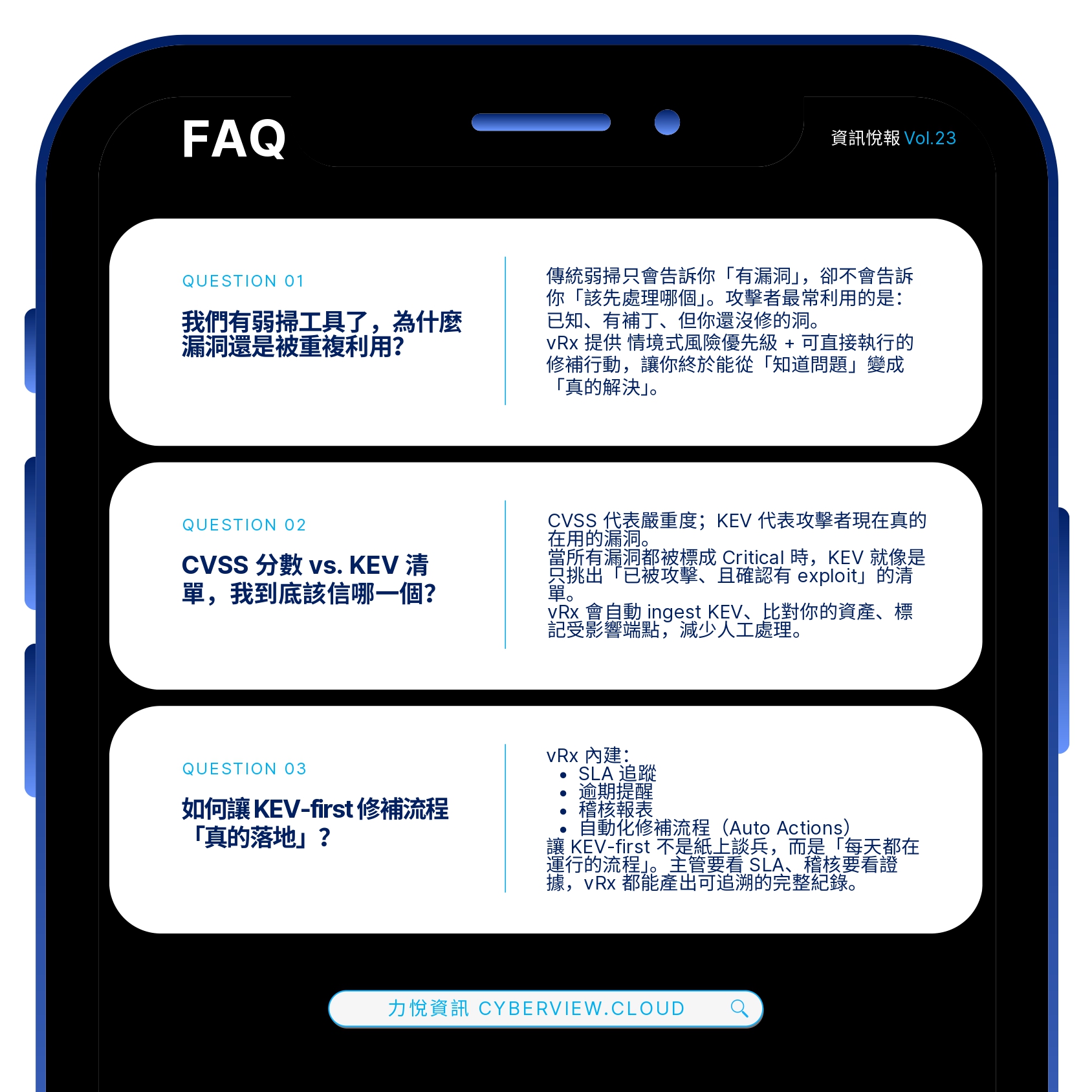對齊 KEV 的安全團隊能更果斷行動,不再迷失在「滿天 Critical」的漏洞清單中,而是把有限資源投注在確實會被攻擊者使用的威脅上。
