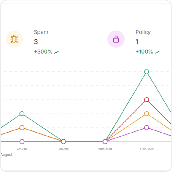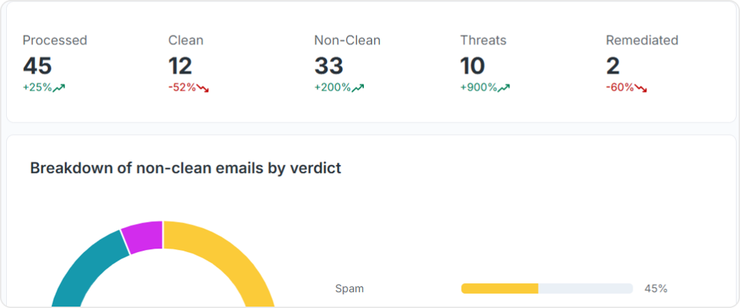 – 多層保護與掃描:商業電子郵件入侵 (BEC) 和假防護可偵測繞過傳統垃圾郵件過濾器的社交工程、網路釣魚和假攻擊。多層偵測包括零時差攻擊和進階威脅防護,可攔截已知和未知的電子郵件威脅。